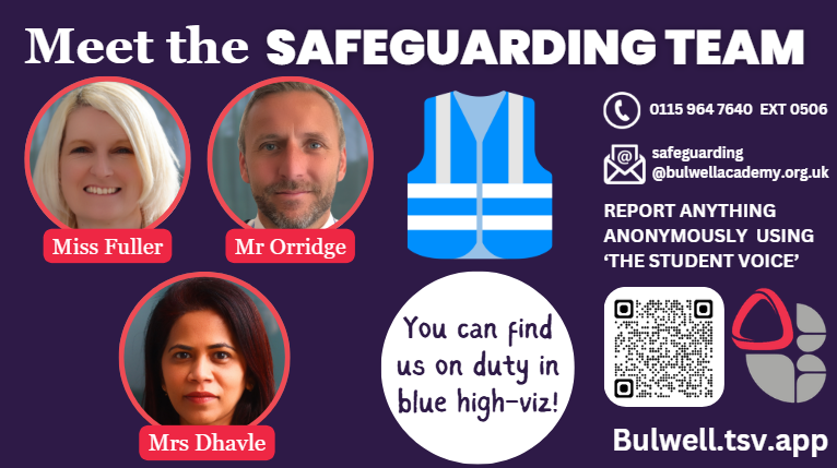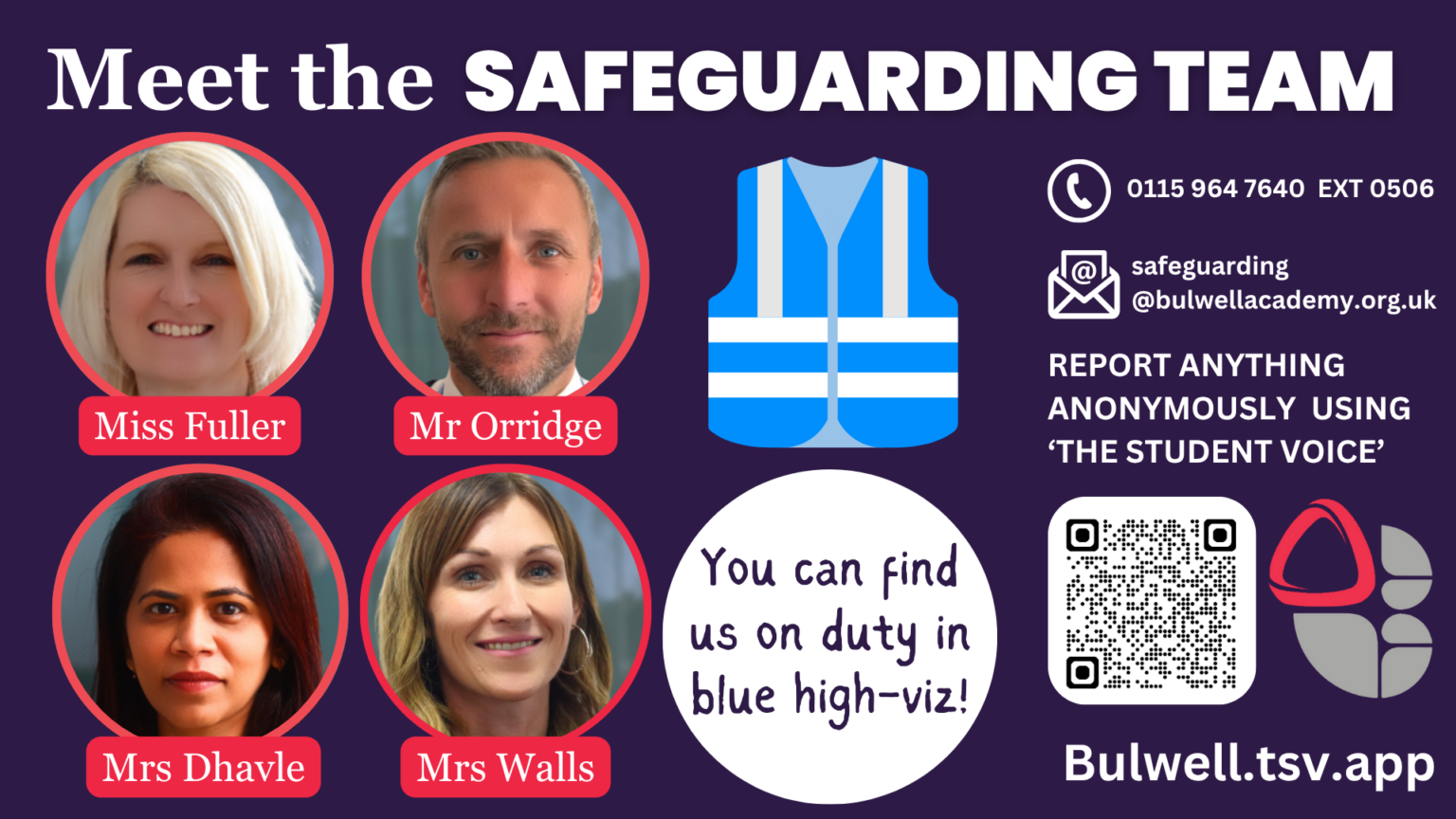 All safeguarding concerns should be reported to the Safeguarding Team. Contact details are on the image above. Please click on the red boxes below to explore more about safeguarding and wellbeing at The Bulwell Academy, including dedicated pages for students and adults.