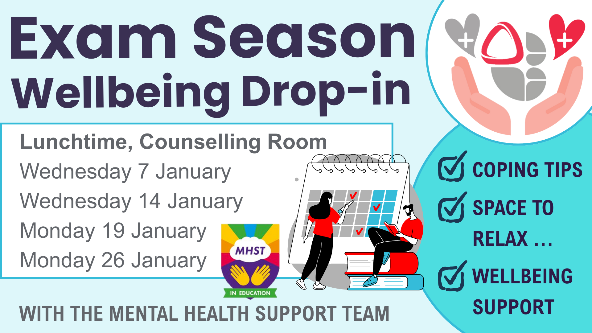 During the Mock Exam period in January, Nottingham City Mental Health Team will be joining us in school at lunchtimes to offer you support. See details below.