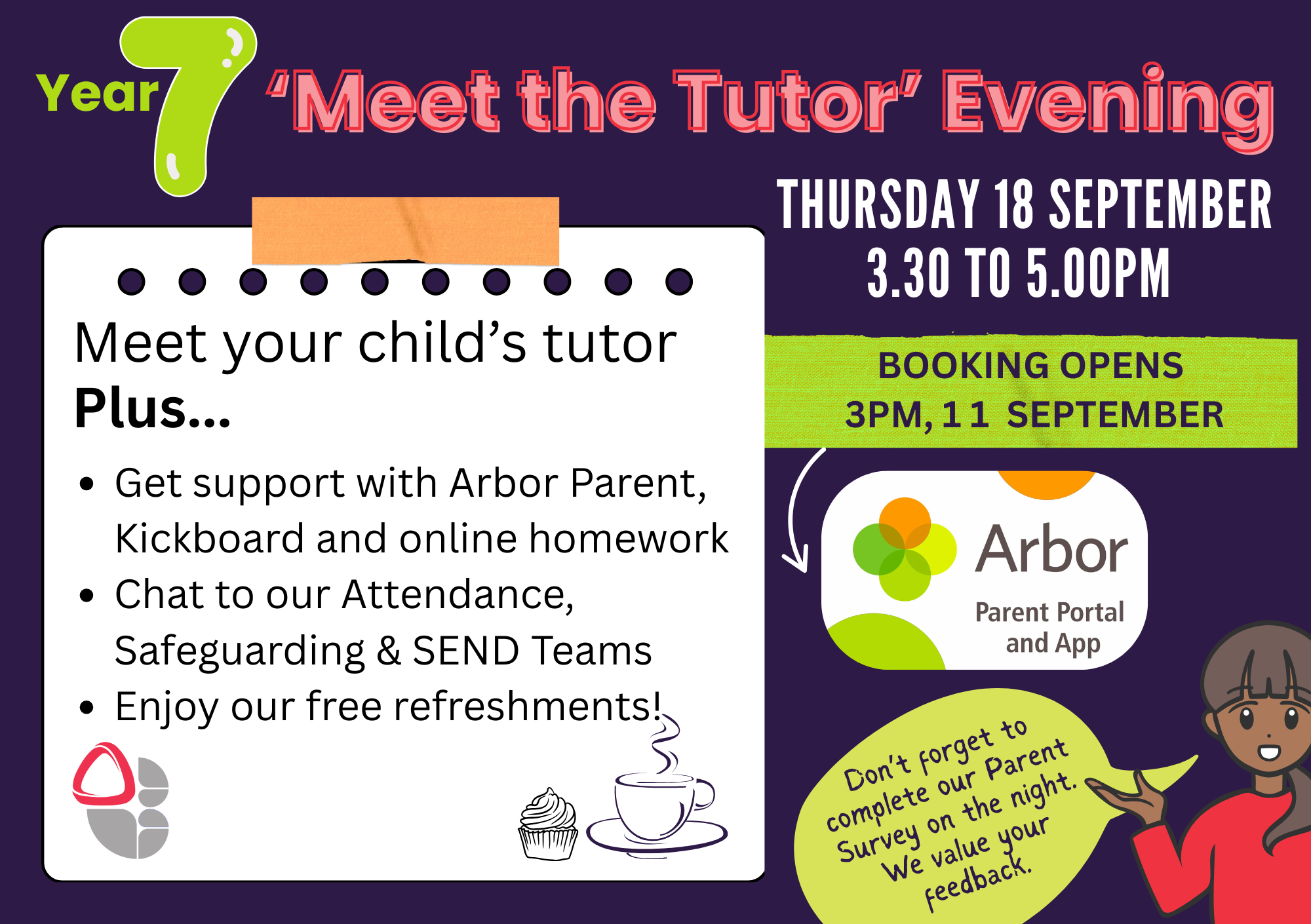 Booking opens on Thursday 11 September at 3.00pm. Come along to this special Year 7 event to meet your child's tutor and access support.